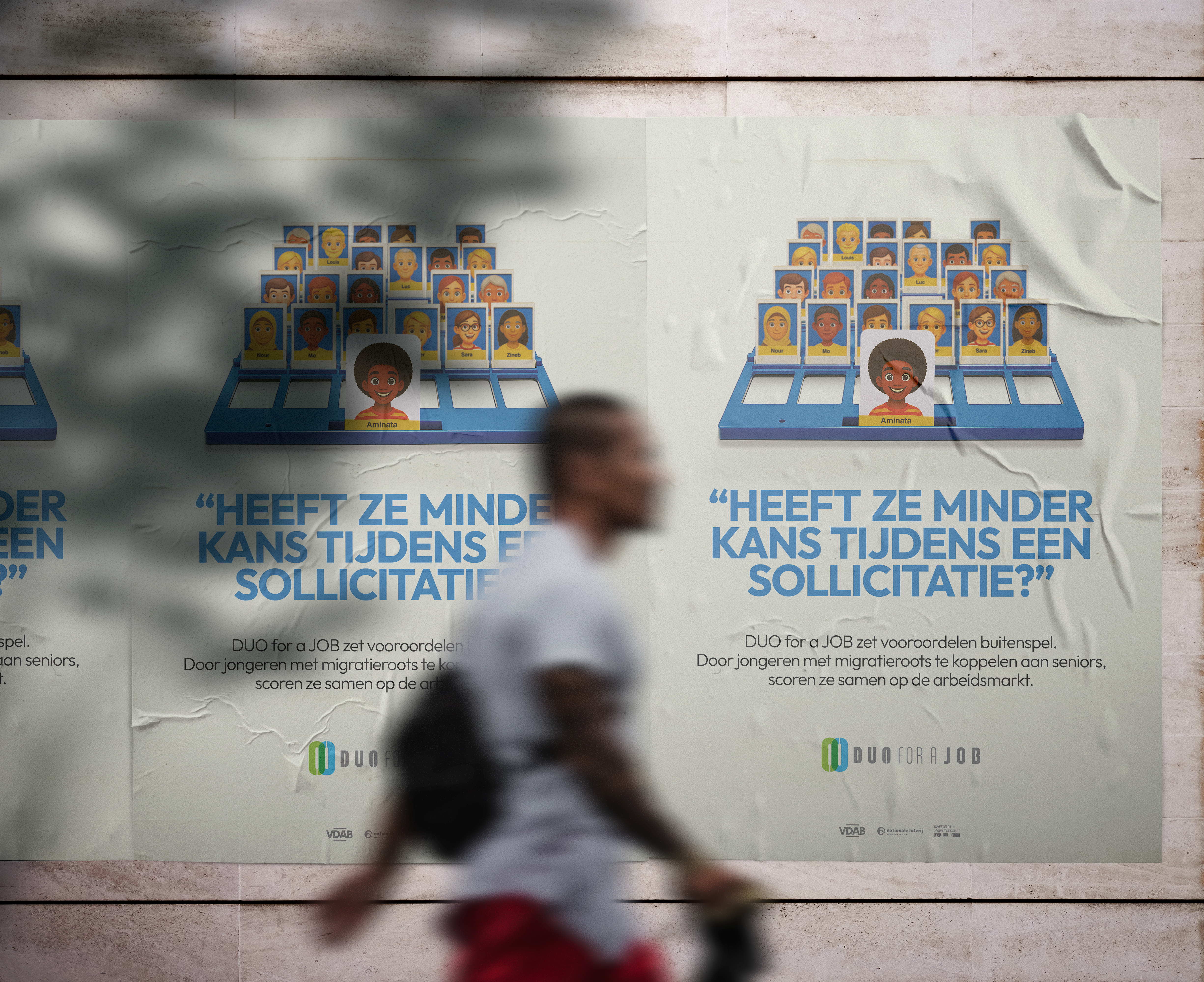 Duo for a job bindt de strijd aan met discriminatie op de arbeidsmarkt, en doet dat met de creatieve power van Manamana. "Het is hoog tijd dat de juiste eigenschappen van mensen doorwegen in een sollicitatietraject", vertelt strateeg Matthias Debruyn. "En daarvoor zijn campagnes met stopping power een geschikt middel."